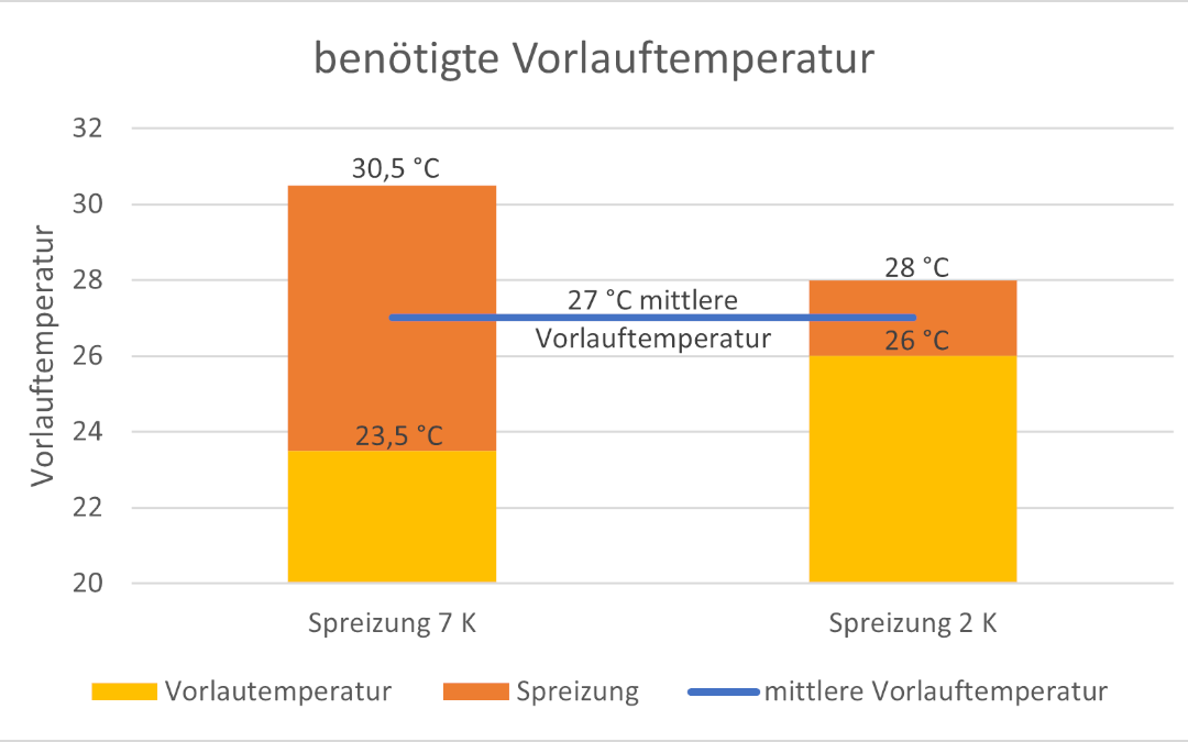 Je langsamer das Heizwasser durch die Rohrstrecke fließt, umso mehr kühlt dieses ab. Um die Vorlauftemperatur trotz Spreizung möglichst gering zu halten, ist es nötig, das Wasser schnellstmöglich durch den Heizkreis zu schicken. Einfluss darauf haben deine Pumpe und der Widerstand in deinem Heizsystem.